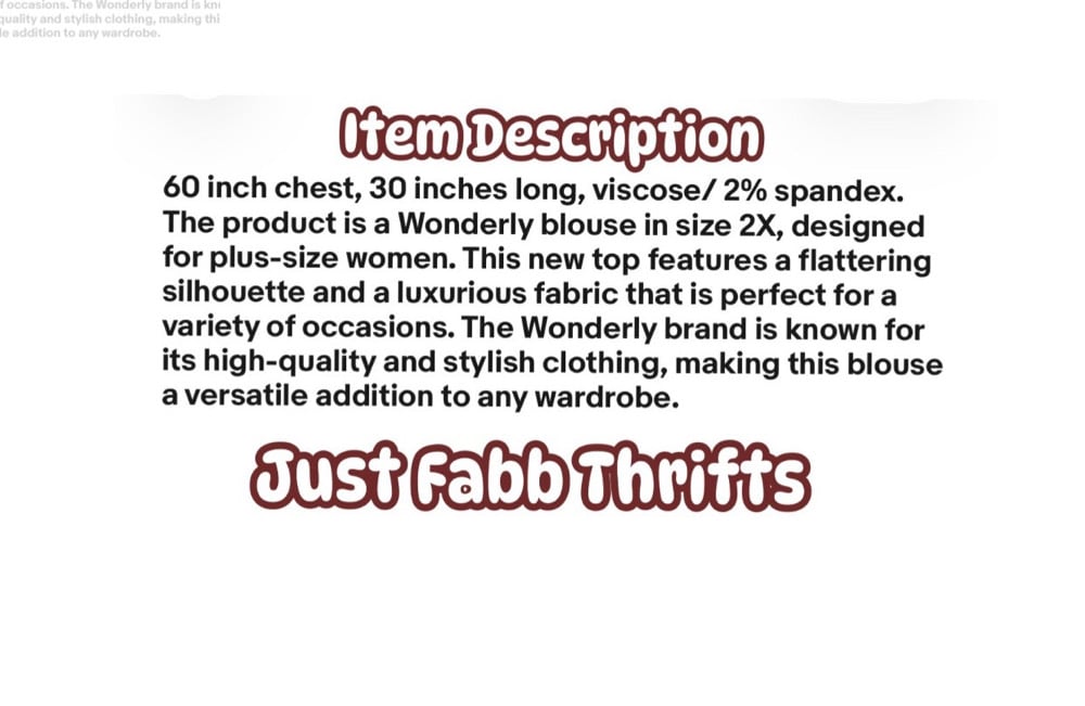 60 inch chest, 30 inches long, viscose/2%spandex. NWOT
