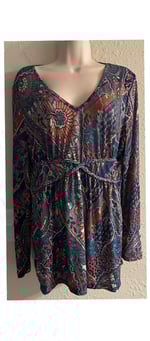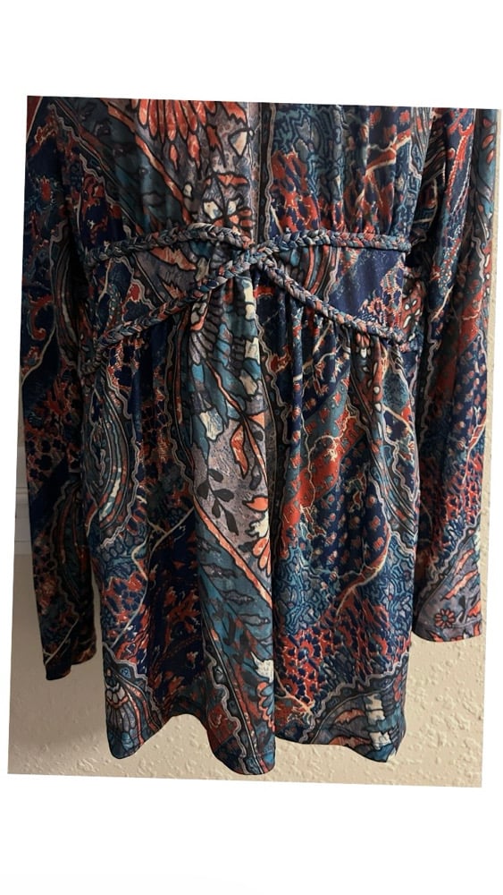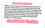 40 inch chest, 30 inches long, polyester/Rayon/6%spandex
