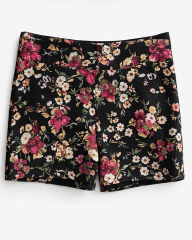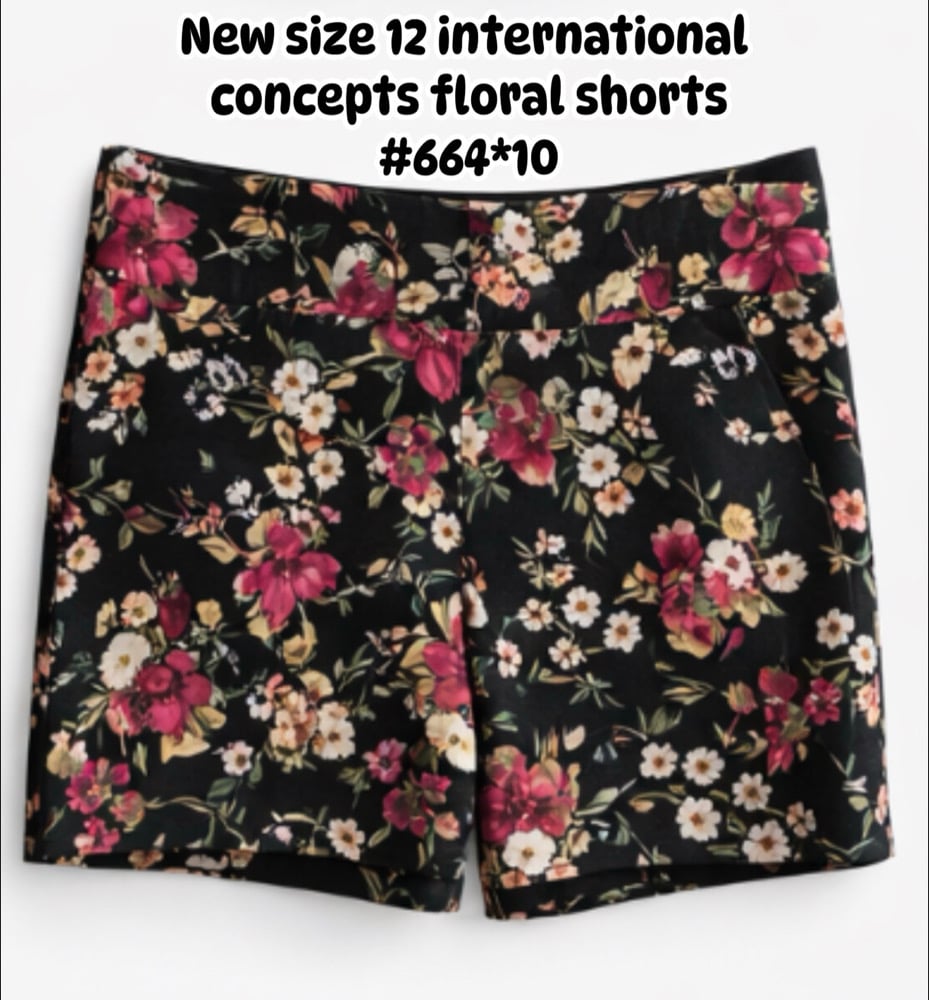 This product is a pair of size 12 international concepts floral shorts. These shorts are designed for women and feature a colorful floral pattern, making them a stylish addition to any wardrobe. The multicolor design add a fun and vibrant touch to the classic short style, perfect for a casual and trendy look. The regular size 12 fit ensures a comfortable and flattering silhouette for any woman who loves to stay on trend with their fashion choices. 32 inch waist, 5 inch inseam, rayon/nylon/3% spandex two pockets.
