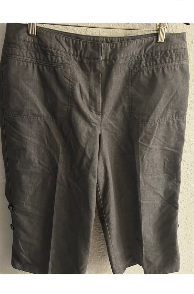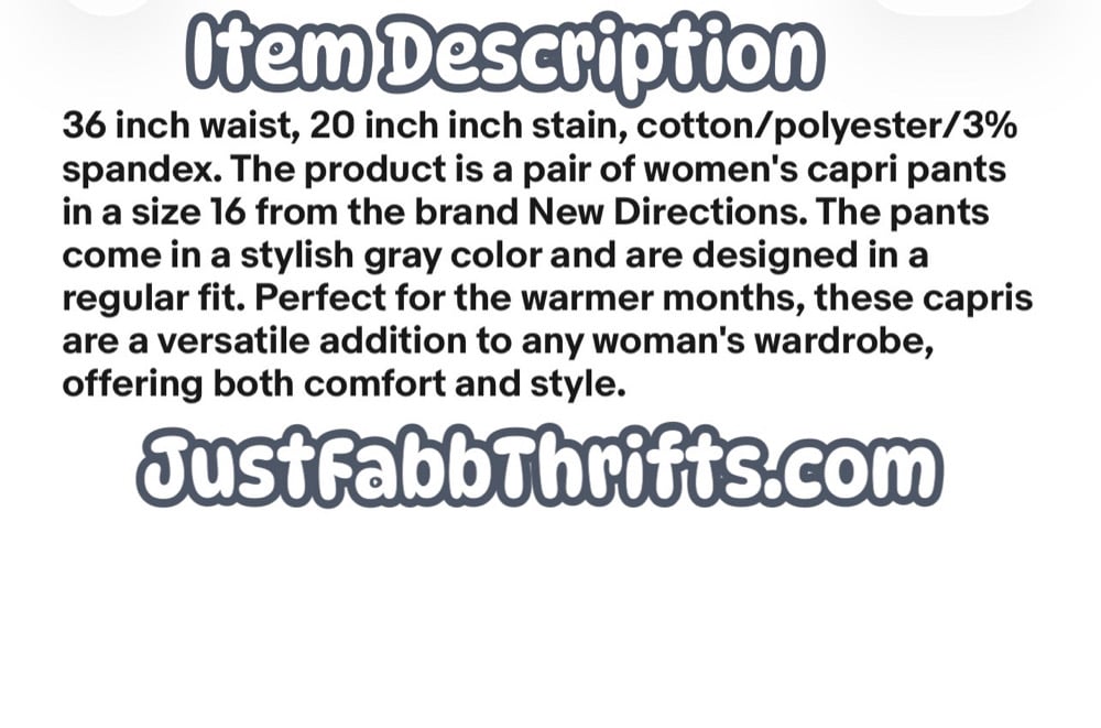 36 inch waist, 20 inch inseam, cotton/polyester/3% spandex. Free gift with every purchase.